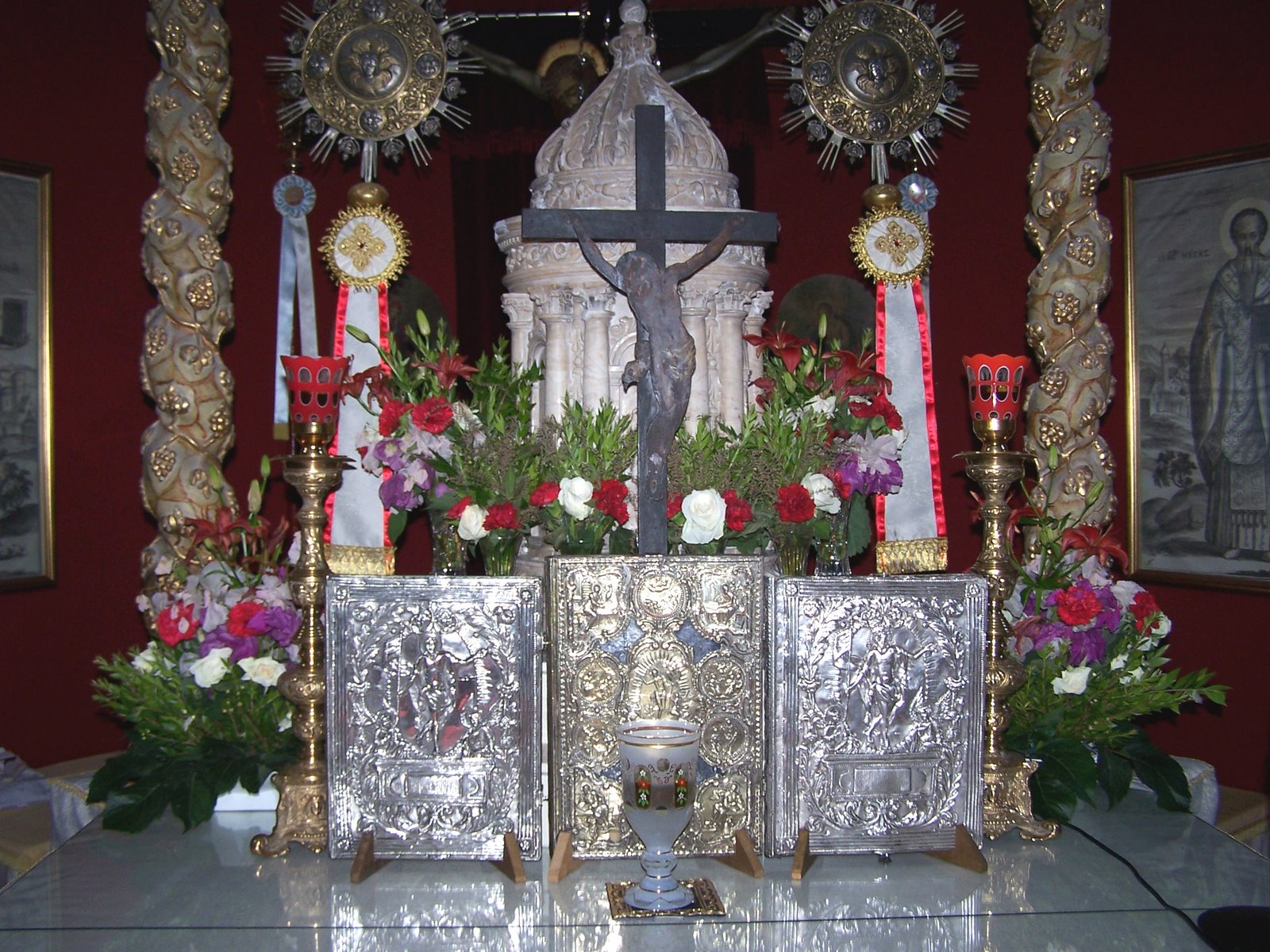 Και έπειτα γυρνώντας μέσα στο ιερό, προς την Ανατολή, ανεβαίνοντας το μικρό σκαλοπατάκι μπροστά από το ξυλόγλυπτο, επιχρυσωμένο και ζωγραφιστό κιβώριο, με έργα πάλι του Σ. Πελεκάση, ατενίζοντας το μοναδικό μαρμάρινο σκαλιστό αρτοφόριο και τη γλυκιά με γεμάτη χαρμολύπη έκφραση του Εσταυρωμένου, γινόσουν έμπλεος συναισθημάτων συντριβής, ταπείνωσης και μηδαμινότητας του σαρκίου αλλά και ταυτόχρονα της τιμής να θωρείς και να ακουμπάς τον Σεσαρκωμένο. Τι οξύμωρο και αντιφατικό, όπως τα πάντα σε τούτη τη ζωή!